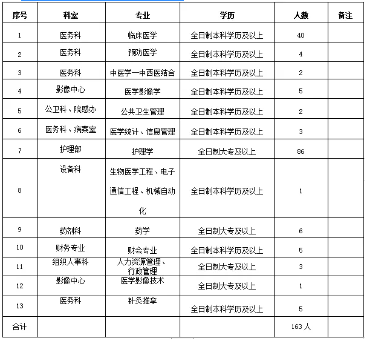 医院根据阿瓦提县医疗卫生人才引进方案的精神,坚持“人才兴院”的发展战略,面向社会及各大院校诚招各类医学专业人才。计划招聘各临床专业(护理、医疗、医技)等163人,具体学科及岗位要求详见《阿瓦提县人民医院医疗专业需求计划表》。